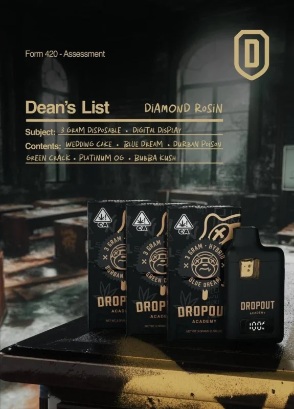 The Dropout Academy Brand stands for quality, innovation, and flavor. Our 3G disposables, carts, and vape devices are designed to deliver potent cannabis experiences, whether you prefer Diamond Rosin, Sugar Rosin, or Shatter Hash blends.
